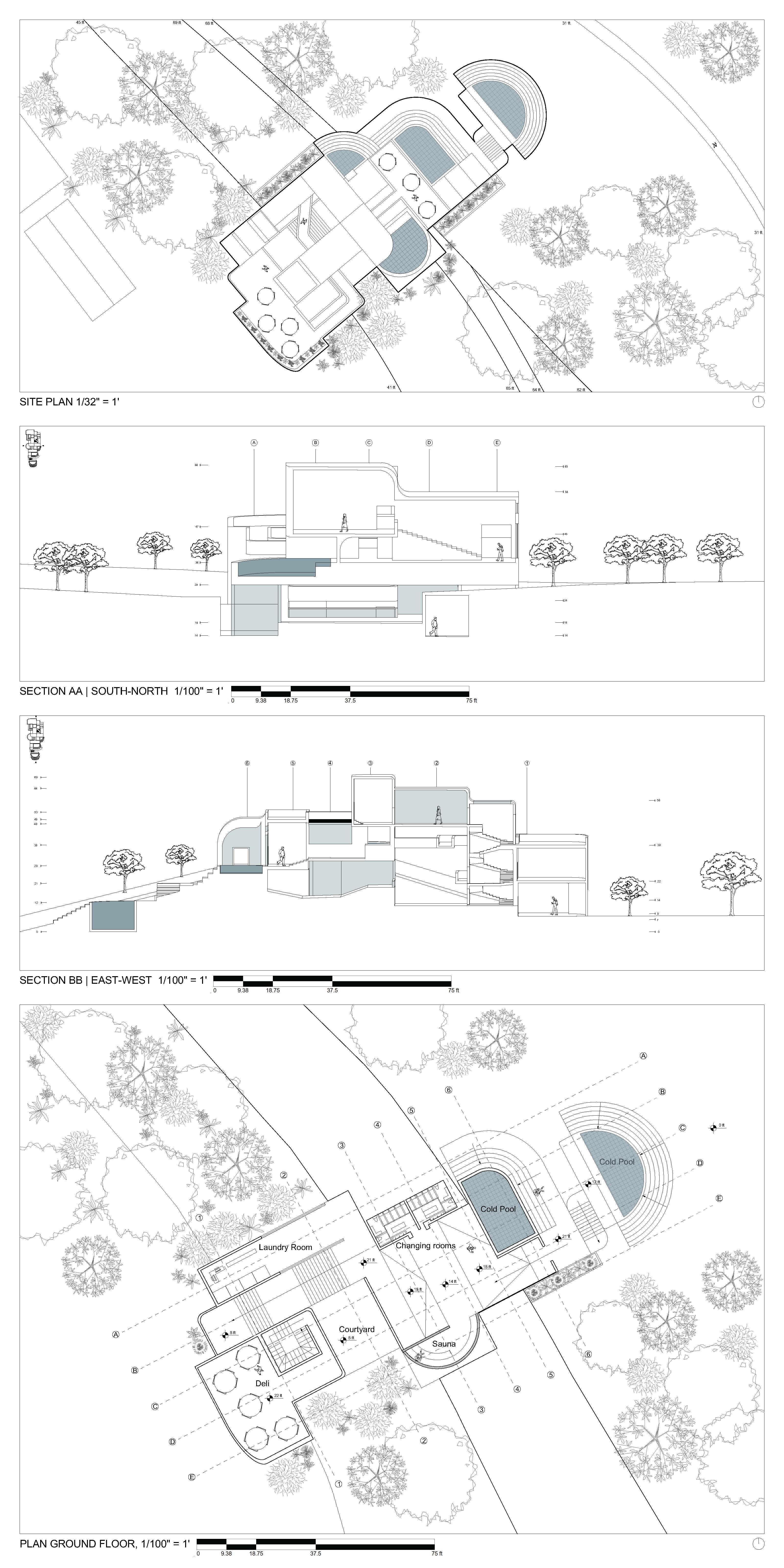 The project addresses the challenge of forming 3 hierarchical spaces by using a variety of carefully incorporated elements. Through this analysis of these elements, three internal logics are revealed; repetition, difference, and juxtaposition.