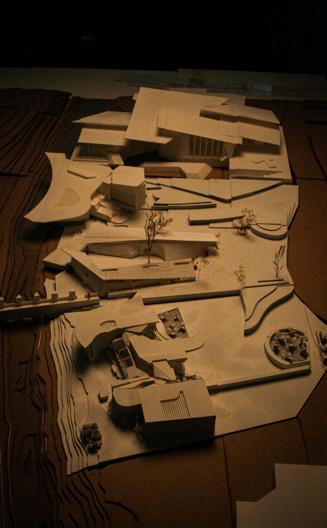 In contradiction to the downward pull of the floor, the roof is angled to pull space circulation and light up the slope. Our roof design is inspired by the Dancing Light House by Kendle Design Collaborative. However, our roof responds to our site and organizations of social to private spaces in the angles each roof plane is tilted. The roof towards the front is the highest tilted angle up while the lowest step has a less inclined roof. This allows for a better feeling of refuge in the private spaces and allows less cover and more light in the social spaces. The roof is supported by a few columns but mainly monolithic masses. The masses are meant to serve as geological and boulder-like in correlation to the surrounding volcanoes and mountains.